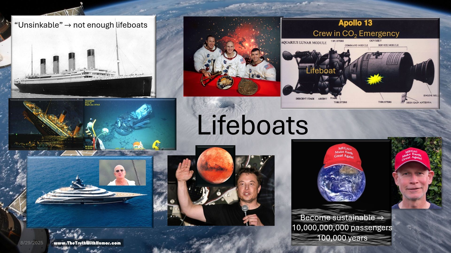 Fellow Castaways on planet Earth, I would like to take the occasion that the commander of the Apollo 13 mission, James A. Lovell, recently passed away to share my thoughts on lifeboats. Please refer to the collage of pictures attached to this post to connect with this text. Most of you are probably familiar with the tragic, but teachable story of the Titanic. Designed and built to be “unsinkable”, the unthinkable happened before the marvel of its time could even finish the maiden voyage. It hit an iceberg that pierced so many sections of the partitioned hull that it could not stay afloat. This was a strike of nature that the designer of the ship had not foreseen. Many passengers died because of the hubristic assumption. The richest of them was John Jacob Astor IV, a well-known American business magnate who was returning from his honeymoon with his pregnant, younger second wife, Madelaine. She survived the disaster. Sadly, there were not enough lifeboats on Titanic because they would have spoiled the view. There was a time where rich aristocrats and gentlemen were willing to sacrifice their own life for women and children, even the ones in Third Class. I am pretty sure that Our “ME FIRST” President would have been found in the first lifeboat, if he was faced with such a moral decision. I came across John Jacob Astor and his connection to the Titanic at a corporate event where close to 50 employees were flown from all over the World for one day to New York, to ring the opening bell of the NASDAQ Exchange. We stayed at the luxury St. Regis Hotel, founded in 1904 by Astor. There was a glass vitrine that mentioned his unfortunate demise. History is interesting and educational. I believe that there is a invaluable lesson from God to all of us in the story of the Titanic. Recently I watched a thought-provoking documentary about the Titan Submersible that was built by the company OceanGate to offer tourist dives to the remains of the Titanic. Sadly, the experimental carbon fiber hull of Titan was crushed by the immense pressure of the icy Atlantic, incrementing the fatality count at this grave site by four precious souls. The implosion of the Titan was so sudden that its passengers could not even send a SOS (Save Our Souls) back up to their mothership. There was also no lifeboat on Titan. The parallels to Titanic are striking. Humans’ vanity and engineering hubris are alive and well. You may want to watch this documentary to appreciate how there were warning signs about the flaws in Titan’s design and implementation. There was an engineer who spoke up and took action to prevent the disaster. He was shut down with a lawsuit. The sub even had a special early failure detection system that recorded the acoustic cracks when individual carbon fibers were breaking. The data was recorded and shows that at some point the rate of fractures was going up massively. The hull essentially went over a failure cliff. These cautionary signs were ignored to save the business. When humans have a choice between riches and life, unfortunately too many of us choose money for ME over the life of others. We are whistling us to our own grave. A rather hopeful and inspiring message is sent from the Apollo 13 disaster that ended well thanks to the creativity and resourcefulness of the crew and the large supporting team back in Houston. After the explosion of an oxygen tank on the service module, the crew of three evacuated to the capacity-for-two Lunar Module. They had to deal with limited oxygen, electricity, and water. To save themselves, they used the engines of the Lunar Module to control their space-drift around the Moon and back to Earth. One of the critical dangers that the crew had to overcome was a deadly buildup of CO2 in their small atmosphere on this six-day long Odyssey. Only by creating a makeshift CO2 scrubbing device from a small set of repurposed, misfit components did they succeed in maintaining their atmosphere healthy enough to stay alive until they could return to the command module for the final successful descend through Earth’s precious but thin atmosphere. When I think what today’s Congress would have recommended them to do, I am pretty sure that Congress would have told the imperiled castaways that they were sending them thoughts and prayers, and that they should light a candle, join the prayers, and perhaps smoke some marijuana to calm their anxiety while slowly perishing in the increasingly toxic atmosphere without addressing the root cause of the emergency. We clearly don’t have a Congress who sees the deadly problems of our times and acts decisively to promote our survival. They just send thoughts and prayers and do a lot of trashtalking while enriching themselves, selling us out serving the special interests. Personally, I am worried about the following deadly sustainability emergencies that are threatening the Earth module that we all share: 1. Dysfunctional national government The US Government system is marketed as a Democracy by our politicians, but it is a DINO (Democracy In Name Only). When we compare the simple scheme of one voter = one vote to the reality of a poorly aged, prototype system with Electoral College rounding up and down the weight of votes in each State, and Gerrymandered districts used to dilute the power of the party that is out of power at the State level, we have a system that is not able to react to small shifts of voter movements to guide the flight of the ship-of-state between Scylla and Charybdis. In this system individual votes don’t matter in most precincts. Only a few districts in a few states provide any input and find themselves inundated with election propaganda and lies. In recent elections we see that unhappy, disoriented voters who are in panic over the careening clown car of corrupted Government are trying to sledge-hammer the stuck steering wheel back and forth to turn the ship around towards safety. The culmination of this erratic a